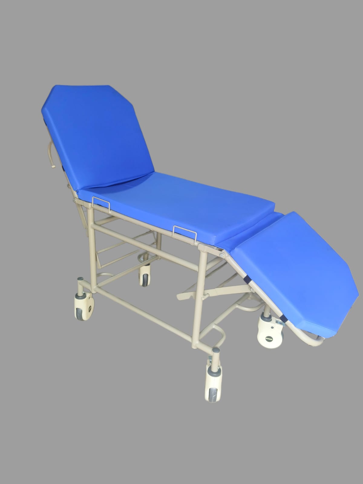Specification :- • Overall approx dimension: 72L X 22D X 30H inch • Strong construction made from MS ERW round tubes dia, without brake • stretcher in top 3- Sections made from M. S. sheet • supported on M. S. tubular frame Pre treated and powder coated finish • WITH 6" Cover Wheel & Mattress Hospital Furniture Manufacturer in India/Gurgaon/Delhi NCR Best Medical furniture supplier/Manufacture in Gurgaon/Delhi NCR Hospital Medical Equipments supplier/Manufacture in Gurgaon/Delhi NCR